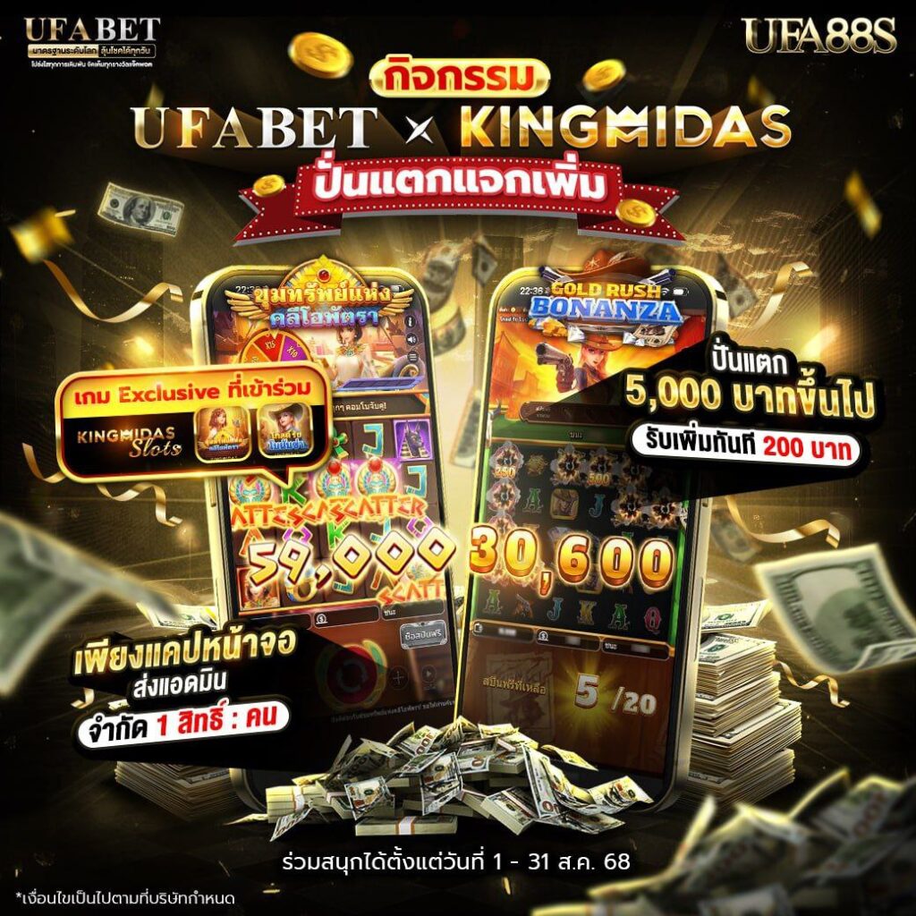 รายละเอียดกิจกรรม : เพียงปั่นสล็อตจากค่าย Kingmidas Slots เฉพาะเกมที่ร่วมกิจกรรม ปั่นแตก 5,000 บาท ขึ้นไป รับเพิ่มทันที่ 200 บาท พร้อมแคปหน้าจอส่งมาที่ ไลน์ : @UFA88SV3